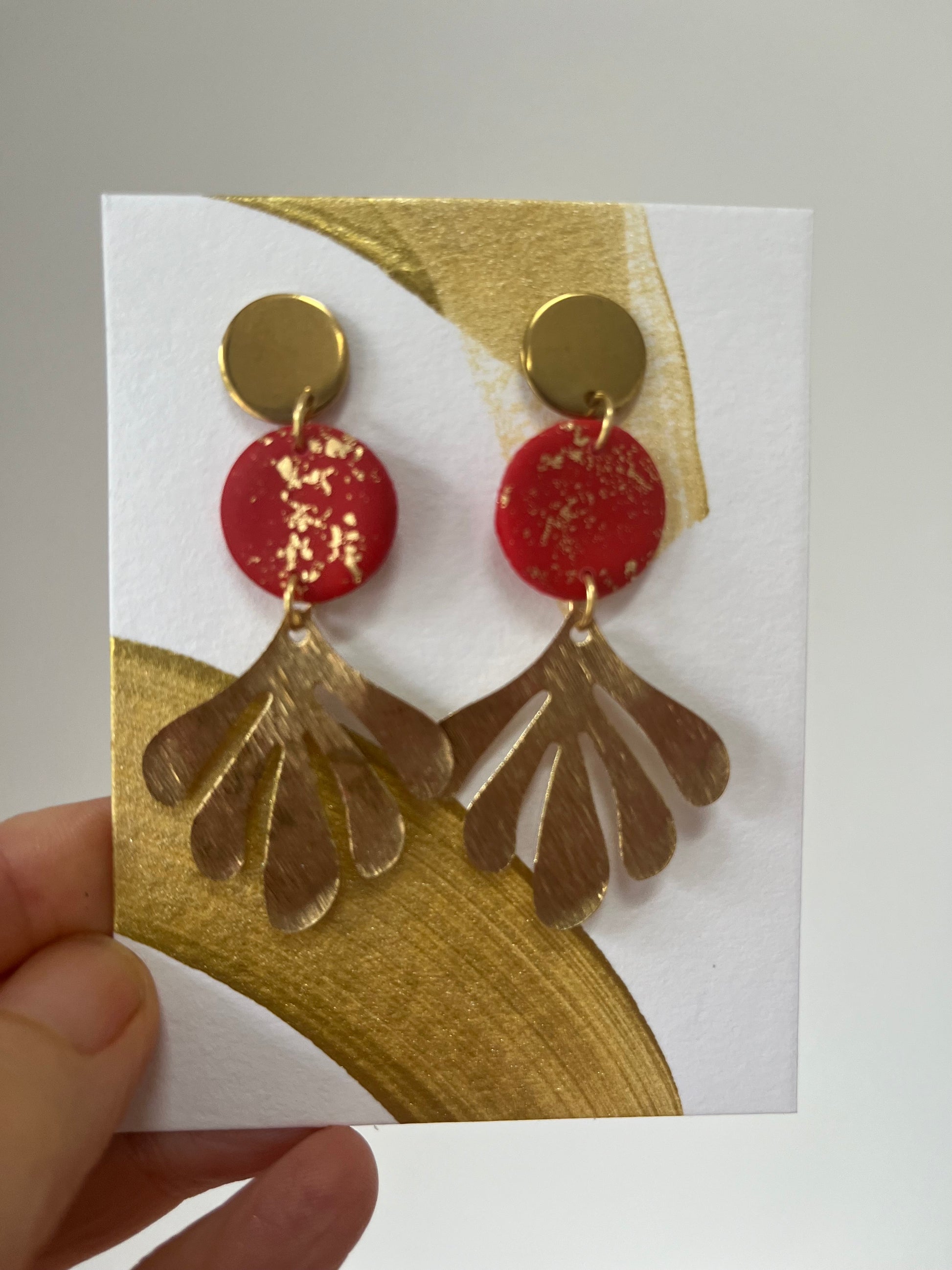 Red and gold disc earrings with brass findings . Gift boxed.