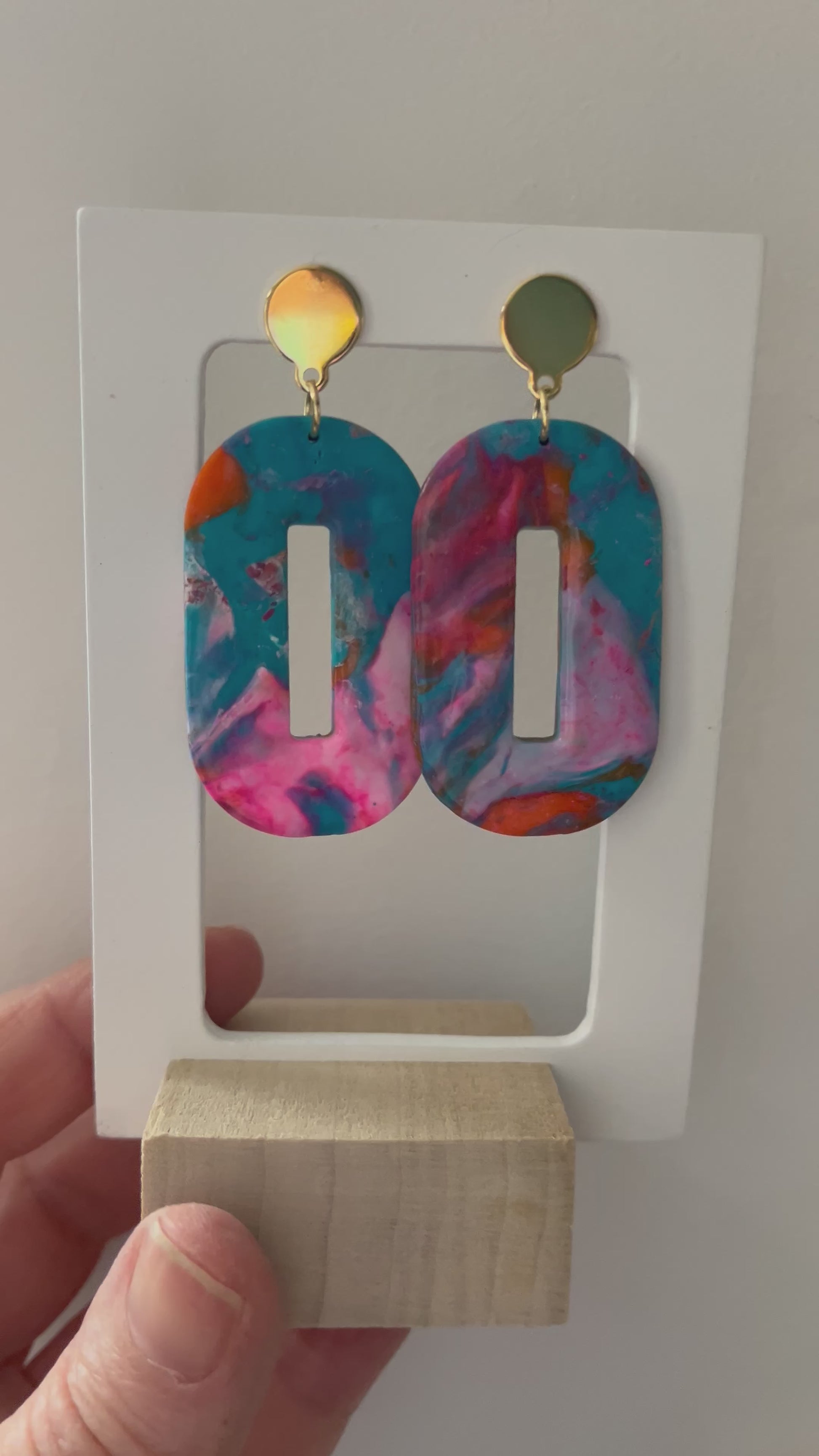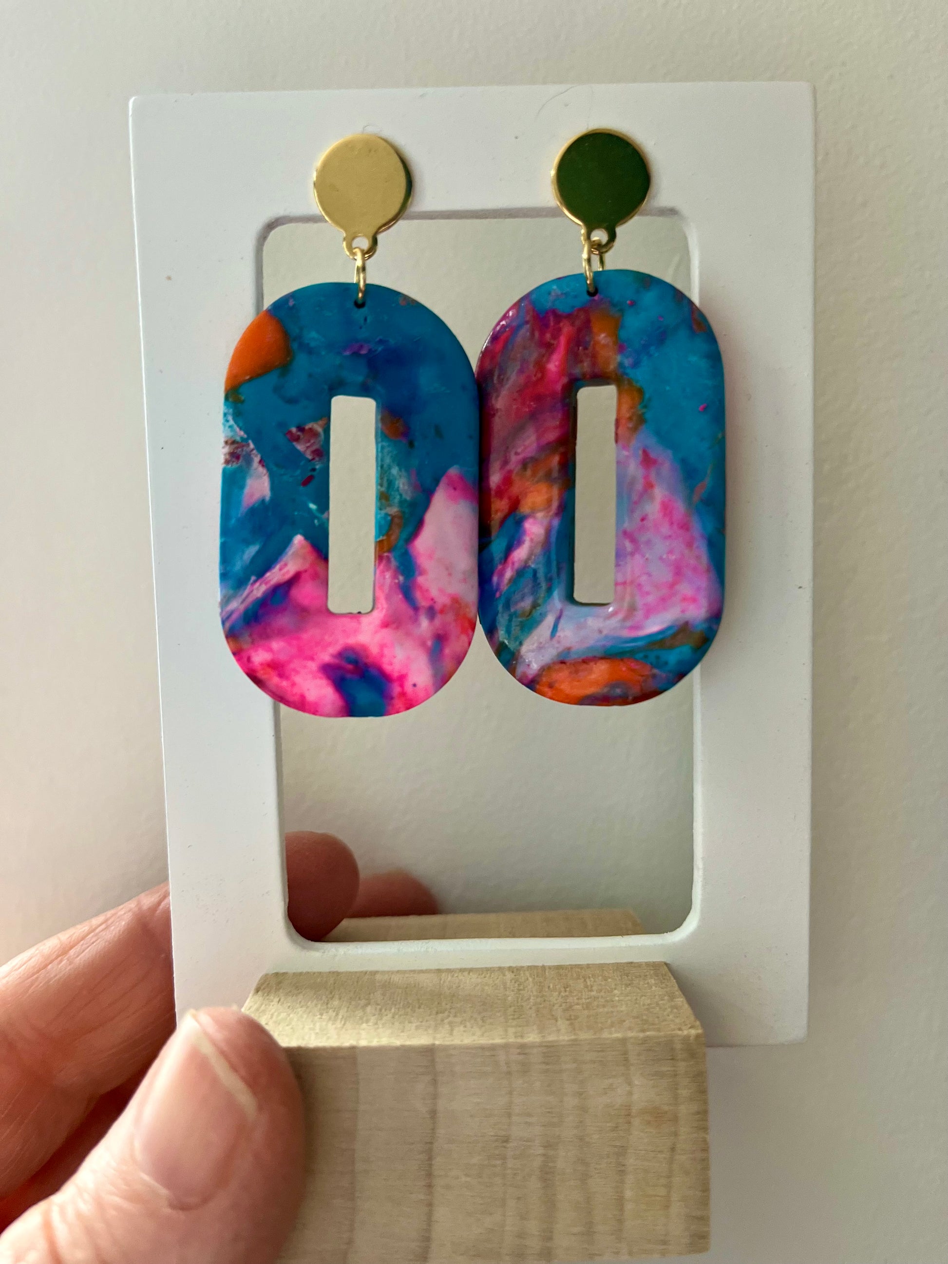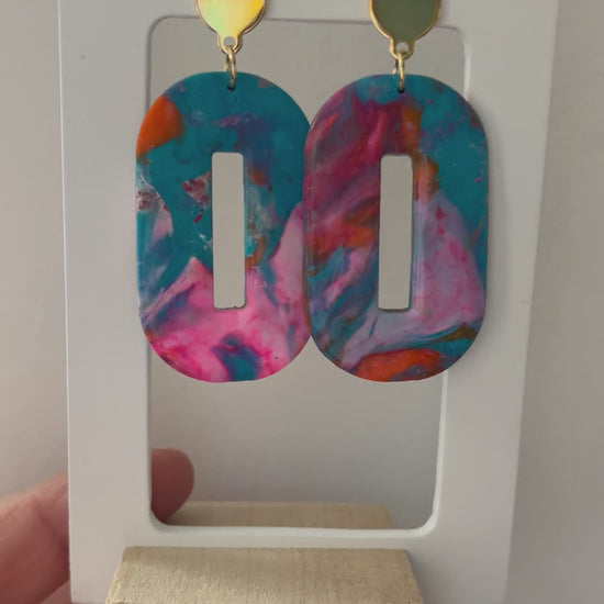 Freya , bold statement earrings in shades of electric blue / pink mix with gold plated stainless steel findings