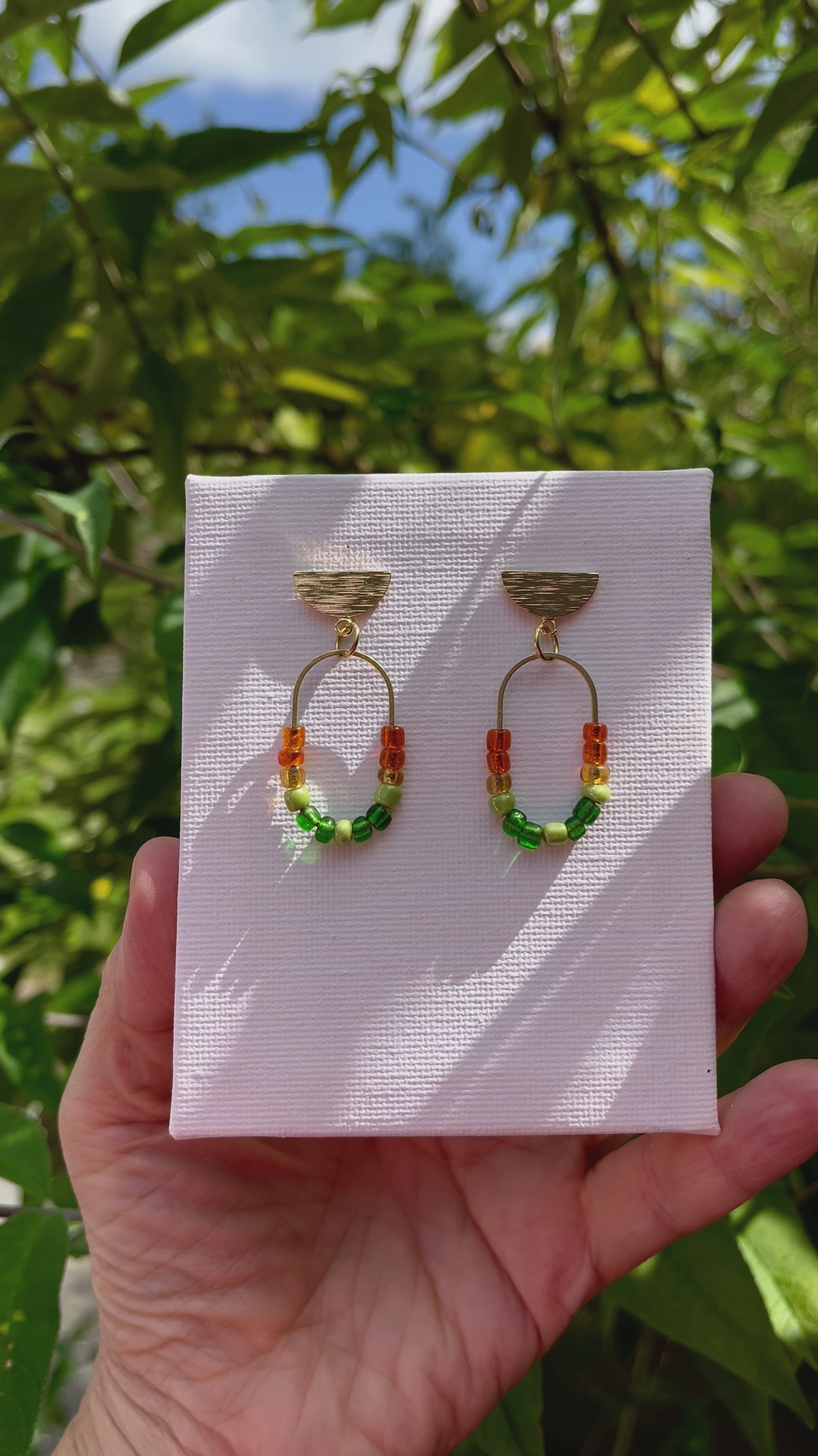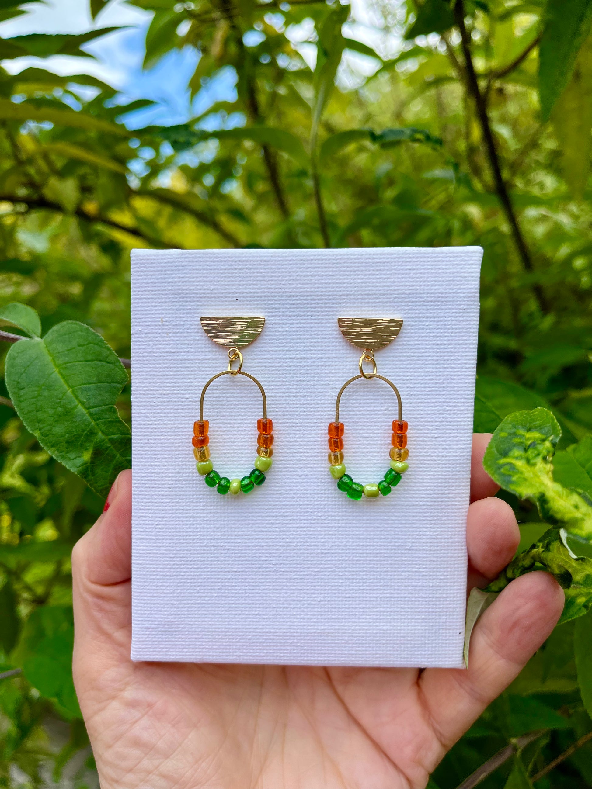 Shades of green and orange teamed with brass and stainless steel findings meld to create a striking blend . Understated and easy to wear .